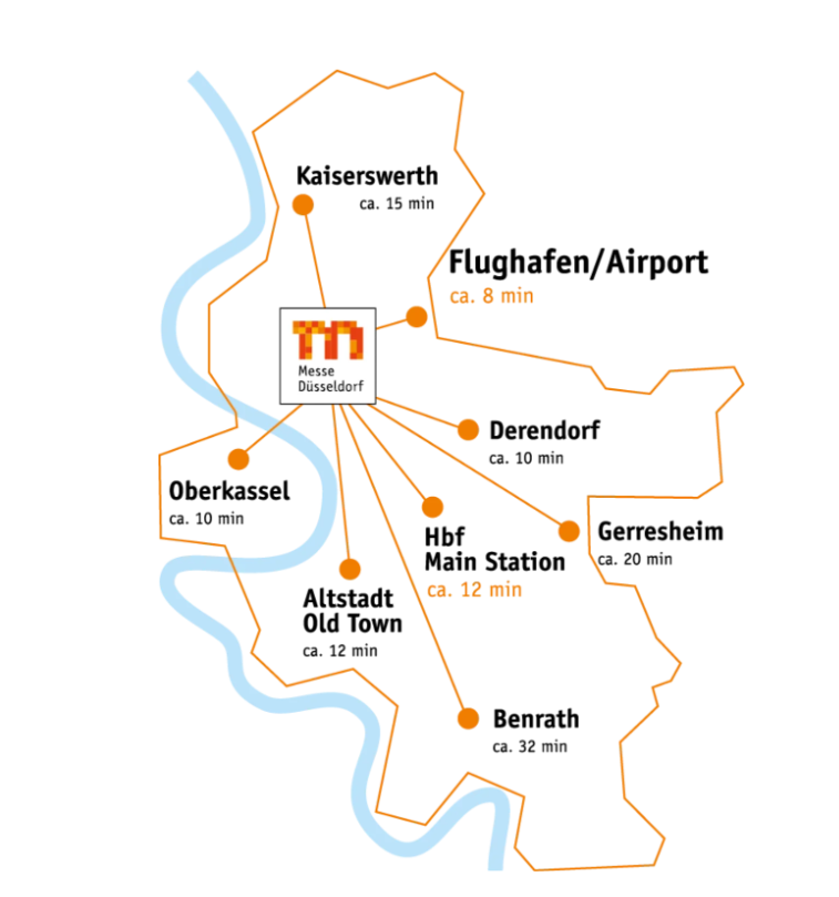 電車線U78、U79以及巴士722都可直接前往展覽中心,展會(huì)期間,還提供896路機(jī)場(chǎng)班車。杜塞爾多夫的主要換乘點(diǎn)是“Hauptbahnhof”和“Heinrich-Heine-Allee”。
